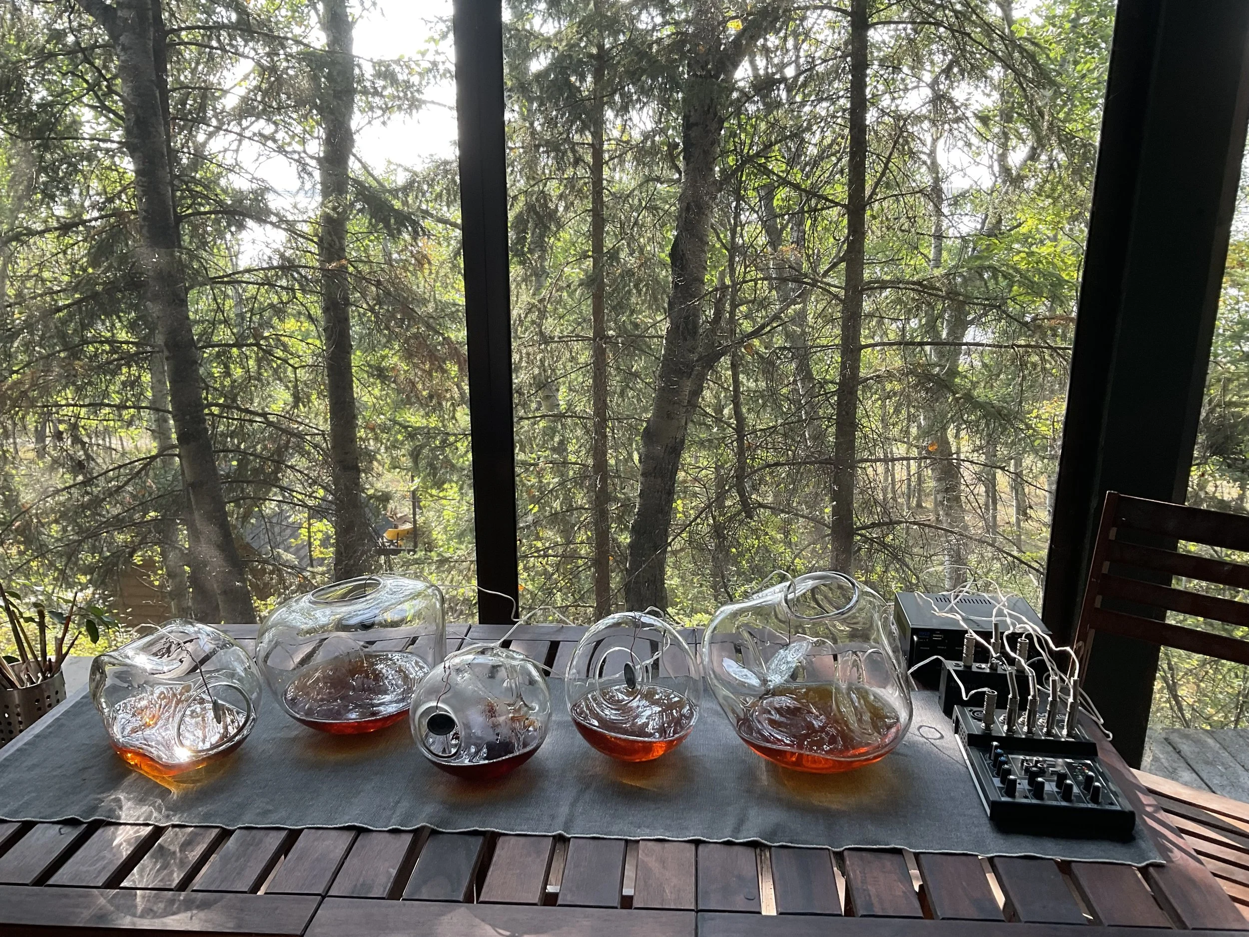 During the residency, through readings, studio visits, and conversations, I set one intention: make the practice lighter. I slowed down, noticing who co-inhabits the field, plants, insects, grass snakes, lichens, and let the work tilt toward withness rather than making more objects. I moved from fabrication to companionship: macro walks, a growing olfactory library of found scents, teas and plant-infused oils made in small, careful batches, dried-plant bundles to keep through winter. I sketched an AI installation seeded by lichen entanglements, fine-tuning language models as if they were spores seeking mutualisms. The aim was not spectacle; it was co presence, a porous relation to place where plants, textures, and quiet infrastructures coauthor form and meaning.